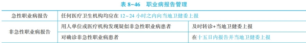 4.職業(yè)病報(bào)告管理 按照《中華人民共和國(guó)職業(yè)病防治法》的要求,用人單位和醫(yī)療衛(wèi)生機(jī)構(gòu)發(fā)現(xiàn)職業(yè)病患者或者疑似職業(yè)病患者時(shí),應(yīng)當(dāng)及時(shí)向所在地衛(wèi)生行政部門(mén)報(bào)告。
