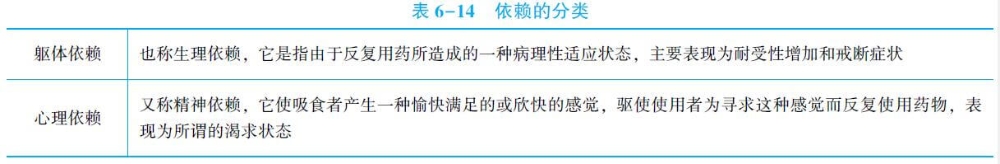 1.依賴 是藥物所致的耐受性增加、戒斷癥狀和強制性覓藥行為,使用者明知會成癮,但依然會使用。分為:心理依賴和軀體依賴。