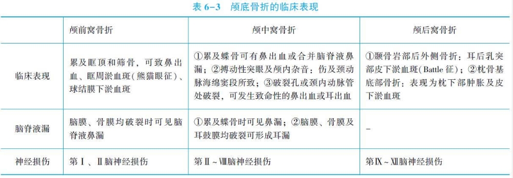 1.臨床表現(xiàn) 顱底部的線形骨折多為顱蓋骨折延伸到顱底,也可由間接暴力所致。根據(jù)發(fā)生部位可分為:顱前窩骨折、顱中窩骨折和顱后窩骨折。