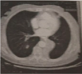 女,42歲,咳嗽,痰中帶血有胸痛6個月,既往體健,吸煙30年,30支/天,查體:T 36.5℃,右側(cè)肺部可聞及濕性啰音,實驗室檢查:血WBC 8×109/L,胸部X線片及CT:如下。