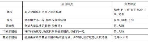 復(fù)習(xí)中注意“地標(biāo)詞”:鱗癌——角化珠;腺癌——腺樣結(jié)構(gòu);黏液癌——分泌黏液;印戒細(xì)胞癌——黏液聚集細(xì)胞內(nèi);基底細(xì)胞癌——基底細(xì)胞樣癌細(xì)胞。