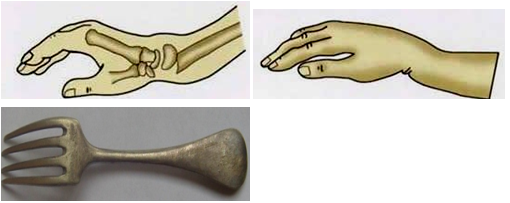 ②“銀叉”畸形:遠(yuǎn)折端向背側(cè)移位,側(cè)面看 |