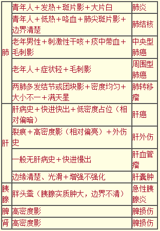(1)肝:若肝實質(zhì)內(nèi)有低密度腫塊影(巨塊型肝癌可有密度更低的壞死灶),應(yīng)診斷為肝癌。若肝包膜下、實質(zhì)內(nèi)有高密度影,表明有出血征象,應(yīng)診斷為肝破裂。