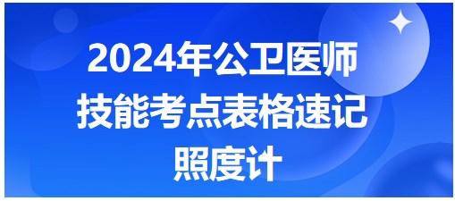 2024公衛(wèi)醫(yī)師考生請注意!實(shí)踐技能考試備考進(jìn)入倒計(jì)時(shí),一定堅(jiān)持每日備考復(fù)習(xí)加深考點(diǎn)記憶!正保醫(yī)學(xué)教育網(wǎng)幫考生整理了2024公衛(wèi)醫(yī)師技能考點(diǎn)表格速記-照度計(jì),趕快來背!