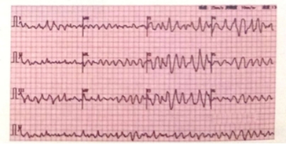 試題2:男,26歲。在參加馬拉松比賽,突然意識喪失5分鐘。最可能的心電圖診斷是(4分)