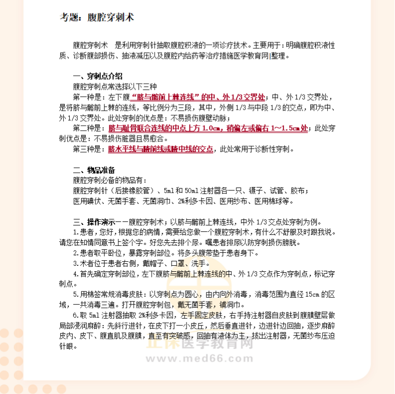 臨床助理執(zhí)業(yè)醫(yī)師實(shí)踐技能基本操作習(xí)題:腹腔穿刺術(shù)!醫(yī)學(xué)教育網(wǎng)編輯整理分享如下內(nèi)容,希望可以幫助大家更好地掌握相關(guān)重點(diǎn)!