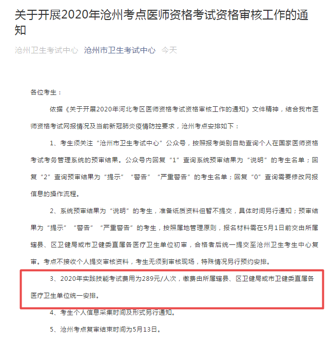 2020年實踐技能考試費用為289元/人次,繳費由所屬轄縣、區(qū)衛(wèi)健局或市衛(wèi)健委直屬各醫(yī)療衛(wèi)生單位統(tǒng)一安排。