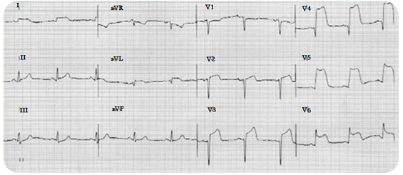 ④心電圖示:竇性心律,V1——V5導(dǎo)聯(lián)ST段弓背向上抬高。(1分)