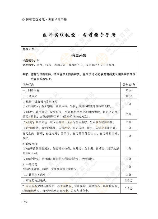 【病史采集26號(hào)習(xí)題】女性,25歲。顏面及雙下肢水腫5天,肉眼血尿2天門診就診!具體內(nèi)容醫(yī)學(xué)教育網(wǎng)編輯整理分享如下,希望對(duì)正在備戰(zhàn)2022年醫(yī)師實(shí)踐技能考試的考生有所幫助!
