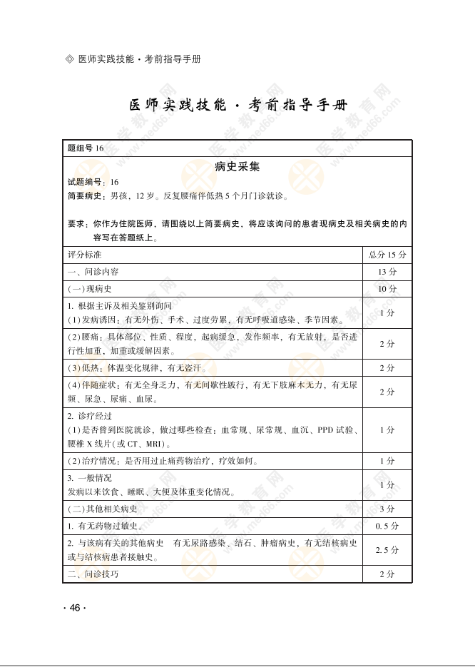 【病史采集16號習(xí)題】男孩,12歲。反復(fù)腰痛伴低熱5個月門診就診!具體內(nèi)容醫(yī)學(xué)教育網(wǎng)編輯整理分享如下,希望對正在備戰(zhàn)2022年醫(yī)師實踐技能考試的考生有所幫助!