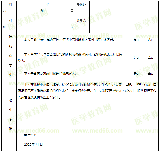 江蘇省2020年醫(yī)師資格考試考生應在考前14天申領“蘇康碼”并每日進行1次健康申報,提前在江蘇省衛(wèi)生健康委網站—信息公開—公示公告欄目(網址:wjw.jiangsu.gov.cn/col/col49383/index.html?number=A)下載打印并簽署《江蘇省醫(yī)師資格考試考生健康旅居申報及承諾書》(附件2),攜帶至考場。所有考生進入考場一律核驗身份(身份證、準考證),出示“蘇康碼”及承諾書,佩戴口罩并一律檢測體溫。下面是江蘇省醫(yī)師資格考試考生健康旅居申報及承諾書,醫(yī)學教育網編輯整理。