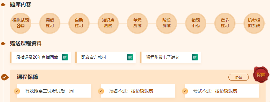 vip簽約特訓營的特點是大膽的刪除費非權(quán)重科目,幫助考生短時間拿到證書,同時后期報班的考生已經(jīng)講過的課程提供錄播回放,不用擔心入班時間問題,所以即使現(xiàn)在報課對于復習時間沒有任何影響的;另外vip是全專業(yè)師資直播,術(shù)業(yè)有專攻,每位老師講自己擅長的科目,從基礎(chǔ)班-強化班-沖刺班,4位核心老師為自己講的科目負責,如果課程丟分太多,老師為大家負責,所以你們能否通過考試,事關(guān)我們的榮譽、事關(guān)網(wǎng)校的榮譽,從講課到做題到答疑全由老師負責。 最后課程報名/考試不通過,協(xié)議(查看協(xié)議詳情>>),不怕付出沒有回報,所以大家放心的去報班,不要有后顧之憂!