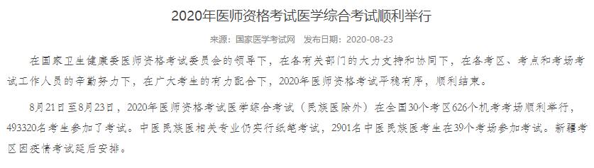 2020年醫(yī)師資格考試人數(shù)再創(chuàng)新低!筆試通過率會提升嗎?國家醫(yī)考中心發(fā)布信息:2020年醫(yī)師資格考試醫(yī)學綜合考試(民族醫(yī)除外)順利舉行,共493320名考生參加了考試。中醫(yī)民族醫(yī)相關(guān)專業(yè)仍實行紙筆考試,2901名中醫(yī)民族醫(yī)考生在39個考場參加考試。新疆考區(qū)因疫情考試延后安排,新疆最新筆試考試時間安排通知>>