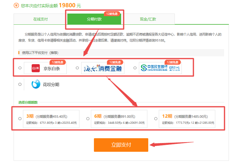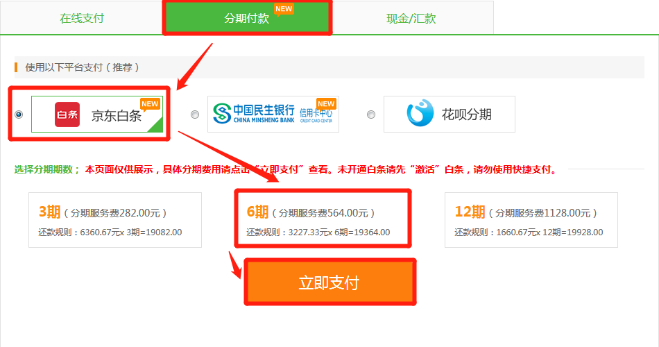 第三步:在支付頁面,選擇分期付款可選擇京東、民生或海爾進行支付!