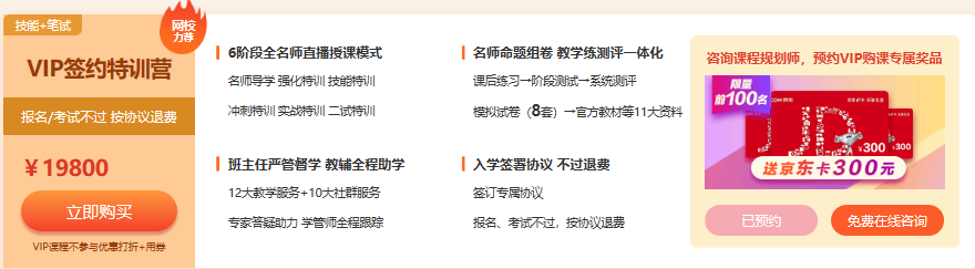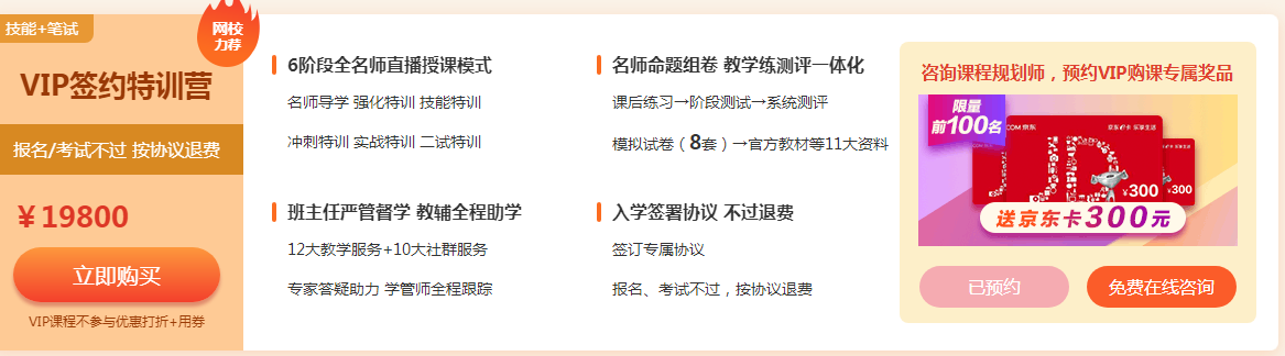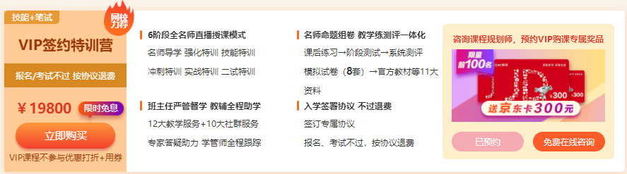 vip簽約特訓營的特點是大膽的刪除非權重科目,幫助考生短時間拿到證書,同時后期報班的考生已經(jīng)講過的課程提供錄播回放,不用擔心入班時間問題,所以即使現(xiàn)在報課對于復習時間沒有任何影響的;另外vip是全專業(yè)師資直播,術業(yè)有專攻,每位老師講自己擅長的科目,從基礎班-強化班-沖刺班,4位核心老師為自己講的科目負責,如果課程丟分太多,老師為大家負責,所以你們能否通過考試,事關我們的榮譽、事關網(wǎng)校的榮譽,從講課到做題到答疑全由老師負責。 最后課程報名/考試不通過,協(xié)議退費(查看協(xié)議詳情>>),不怕付出沒有回報,所以大家放心的去報班,不要有后顧之憂!