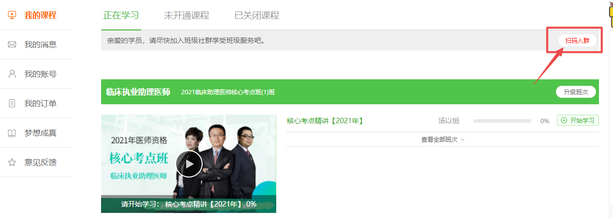 第一步:點(diǎn)擊購買課程后進(jìn)入我的網(wǎng)校我的家——我的課程——掃碼入群;