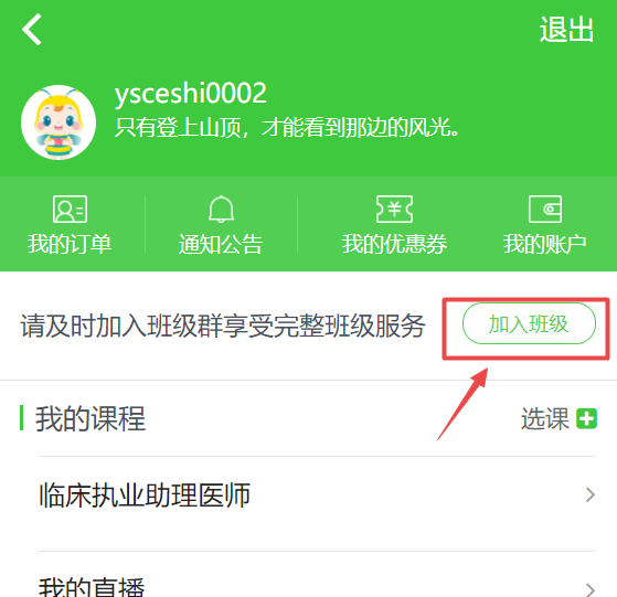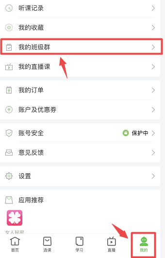 第一步:點(diǎn)擊購買課程后進(jìn)入我的——我的班級群;