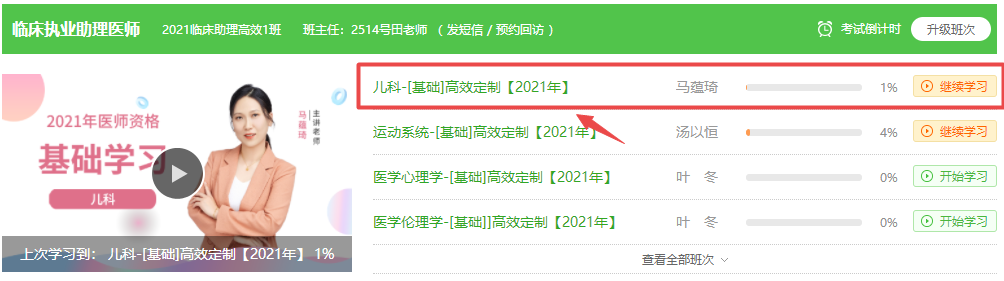 已結(jié)課!2021年臨床執(zhí)業(yè)助理醫(yī)師課程馬蘊(yùn)琦老師-兒科學(xué)基礎(chǔ)學(xué)習(xí)新課已更新完畢!已購課同學(xué)可以直接進(jìn)入我的網(wǎng)校我的家-我的課程-兒科學(xué)科目進(jìn)行學(xué)習(xí)!2021年臨床助理兒科學(xué)考試大綱無變動,2021年新教材有部分變動。具體內(nèi)容下方查看。未購課學(xué)員點(diǎn)擊此處進(jìn)入選擇,具體看課位置如下: