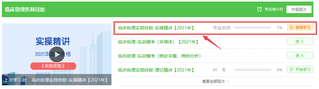 2021年臨床助理醫(yī)師考試《實踐技能-實操精講》新課更新啦!已購課同學(xué)可以直接進(jìn)入我的網(wǎng)校我的家-我的課程-實踐技能-實操精講進(jìn)行學(xué)習(xí)!2021年臨床助理實踐技能考試大綱無變動,2021年新教材有部分變動。具體內(nèi)容下方查看。未購課學(xué)員點擊此處進(jìn)入選擇,具體看課位置如下: