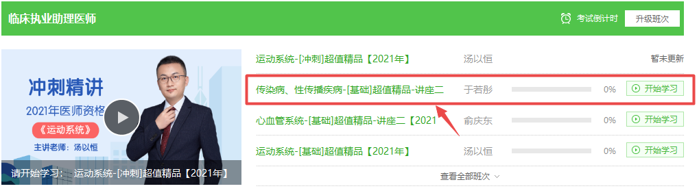2021年臨床助理醫(yī)師考試于若彤《傳染病、性傳播疾病》基礎(chǔ)學(xué)習(xí)班講座二新課更新啦!已購(gòu)課同學(xué)可以直接進(jìn)入我的網(wǎng)校我的家-我的課程-傳染病、性傳播疾病-講座二進(jìn)行學(xué)習(xí)!2021年臨床助理傳染病、性傳播疾病大綱無(wú)變動(dòng),2021年新教材有部分變動(dòng)。具體內(nèi)容下方查看。未購(gòu)課學(xué)員點(diǎn)擊此處進(jìn)入選擇,具體看課位置如下: