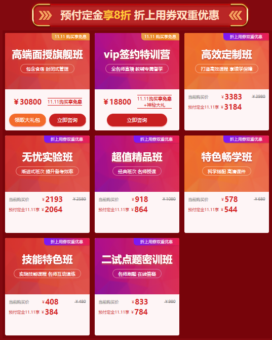 (3)優(yōu)惠券可以與雙十一85折和8折同時享受,用于購買本活動頁面課程(除面授及VIP班次)。