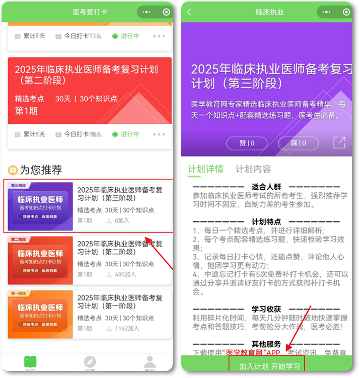 請(qǐng)選擇“您的備考計(jì)劃”,如臨床執(zhí)業(yè)醫(yī)師備考復(fù)習(xí)計(jì)劃(第三階段),然后點(diǎn)擊下方“加入計(jì)劃開(kāi)始學(xué)習(xí)”按鈕,開(kāi)始正式進(jìn)入打卡學(xué)習(xí);