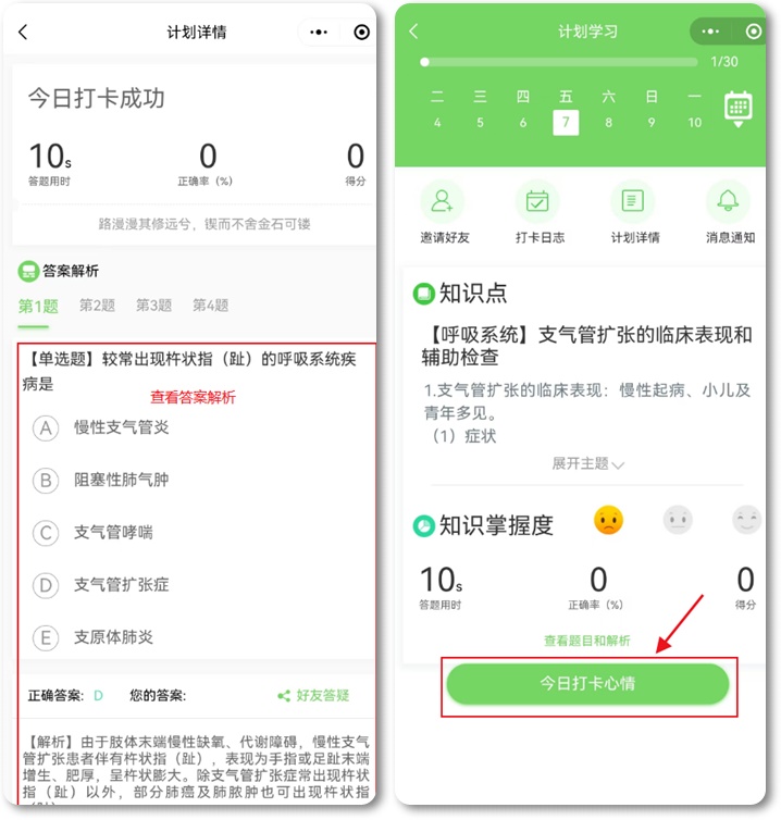 做完題后,可以查看每道題的解析和整體做題情況,進(jìn)入計(jì)劃頁(yè)面也可點(diǎn)擊“今日打卡心情”,輸入您要分享記錄的內(nèi)容,提交即可完成打卡。