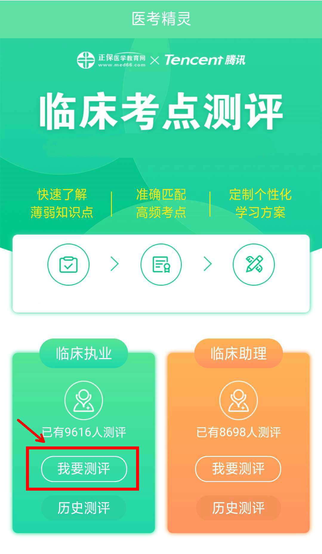 一、進(jìn)入醫(yī)考精靈頁面,現(xiàn)在考試科目,進(jìn)入“我要測(cè)評(píng)”。 點(diǎn)擊進(jìn)入