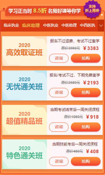 2019年臨床執(zhí)業(yè)助理醫(yī)師成績(jī)公布,也就是說2019年臨床執(zhí)業(yè)助理醫(yī)師考試告一段落,2020年臨床執(zhí)業(yè)助理醫(yī)師考試備考正式開啟!同樣,醫(yī)學(xué)教育網(wǎng)為大家送來2020年臨床執(zhí)業(yè)助理醫(yī)師的優(yōu)惠課程,請(qǐng)查收!