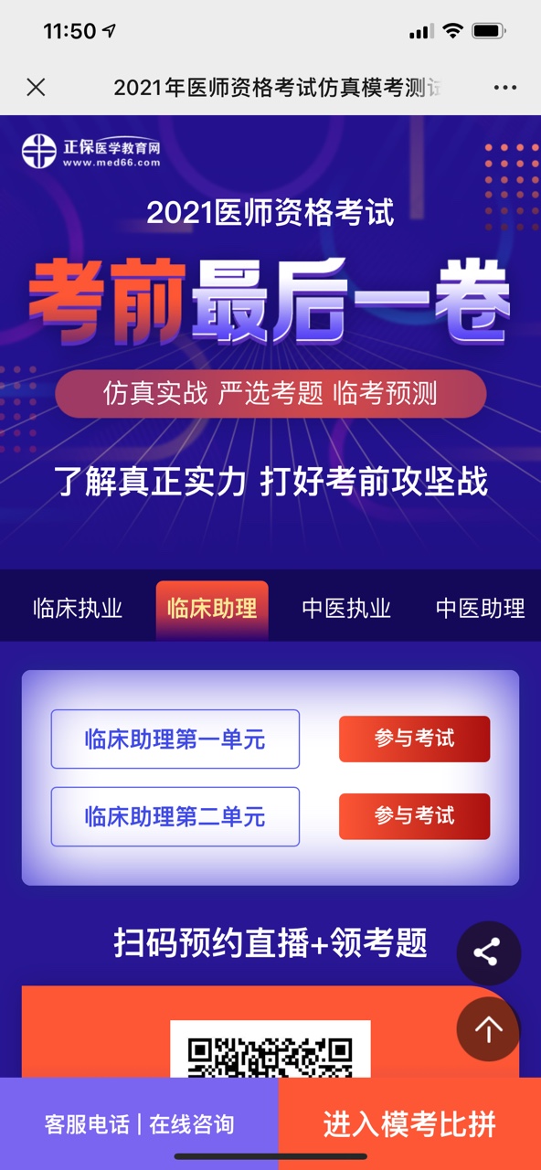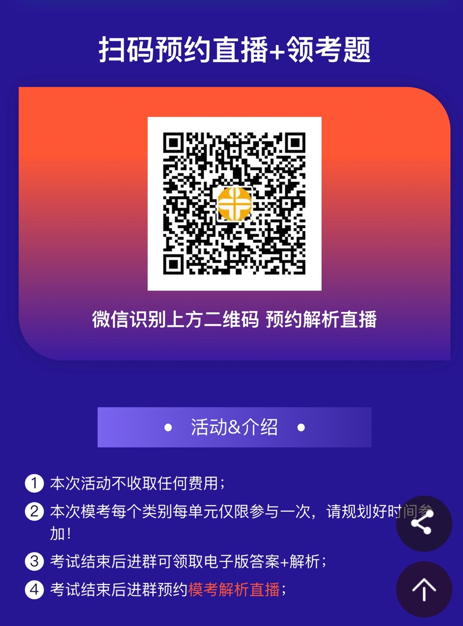 距離2021年臨床助理醫(yī)師考試不到兩周了,此時此刻的你是不是非常想要做一套靠譜的卷子?現(xiàn)在來了,二模試卷來了,想要做題的考生要抓緊時間做題啦,掃描下方“臨床助理醫(yī)師??即筚?/span>”二維碼,進入???。