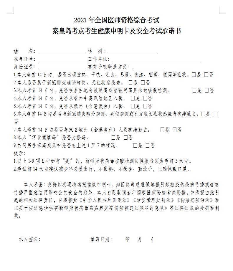 附件: 2021年全國醫(yī)師資格綜合考試秦皇島考點(diǎn)考生健康申明卡及安全考試承諾書