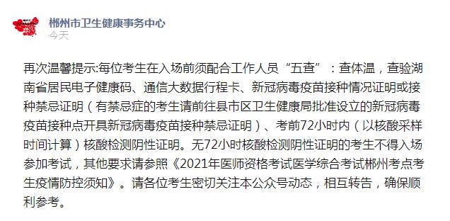 郴州考點(diǎn)2021年臨床助理醫(yī)師資格考試考前特別提醒!每位考生在入場前須配合工作人員“五查”,建議各位考生按要求提前準(zhǔn)備相關(guān)材料,具體通知內(nèi)容如下: