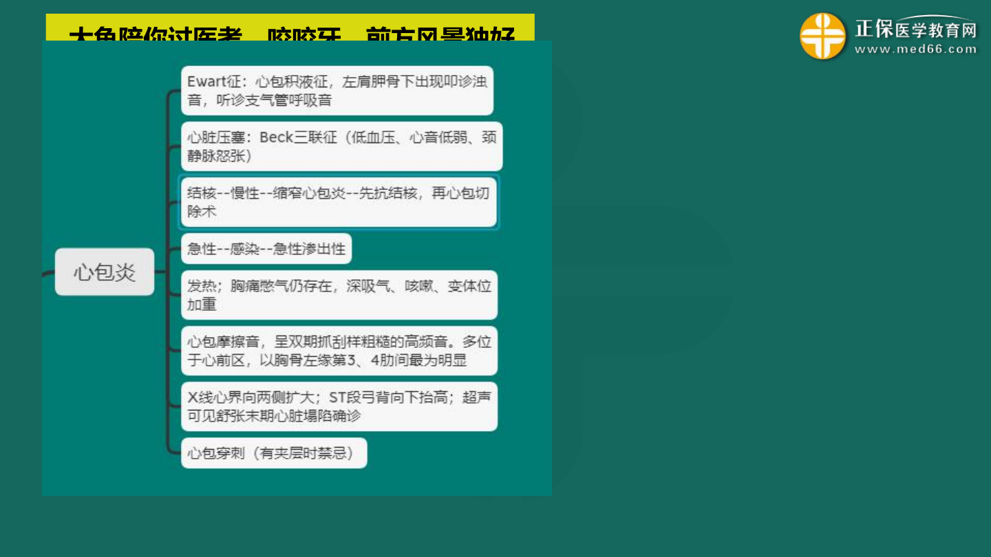 以上就是醫(yī)學(xué)教育網(wǎng)關(guān)于“大魚老師帶你考前拿下臨床助理醫(yī)師「心包炎」高頻考點(diǎn)!”的相關(guān)介紹,希望能夠幫助到大家,更多干貨盡在醫(yī)學(xué)教育網(wǎng)!