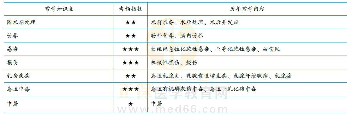 其他這部分內(nèi)容比較雜,但考題不難,核心考點(diǎn)比較明確。zui容易命題、zui該重點(diǎn)掌握的得分點(diǎn)包括——乳腺疾病、燒傷、外科感染、中毒、圍手術(shù)期處理