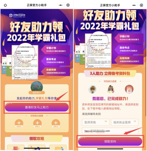 二、點(diǎn)擊“邀請(qǐng)好友馬上助力”,分享到給微信好友進(jìn)行助力;助力滿三人進(jìn)入領(lǐng)取頁面,輸入類別/郵箱,點(diǎn)擊“領(lǐng)取資料”,即可領(lǐng)取“學(xué)霸禮包”。