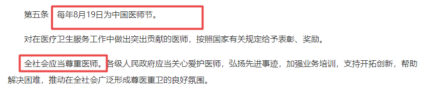 二是《醫(yī)師法》開篇總則第一句即為“為了保障醫(yī)師合法權(quán)益”,體現(xiàn)出國家對醫(yī)師權(quán)益的重視,也體現(xiàn)了立法宗旨和法治精神;同時第五明確“每年8月19日為中國醫(yī)師節(jié)”“全社會應(yīng)當尊重醫(yī)師”,體現(xiàn)出對廣大醫(yī)務(wù)工作者的關(guān)懷和肯定,也可以激勵醫(yī)師更好地為社會大眾提供高質(zhì)量服務(wù)。