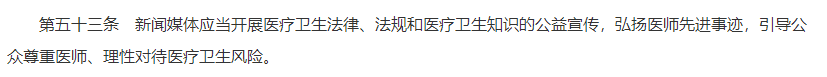 尤其需要指出的是,媒體在醫(yī)患關(guān)系營造方面的作用不容忽視,本法規(guī)定新聞媒體報道醫(yī)療衛(wèi)生事件應(yīng)當做到真實、客觀、公正等。這種規(guī)定能夠促進醫(yī)患互信、維護醫(yī)師合法權(quán)益。