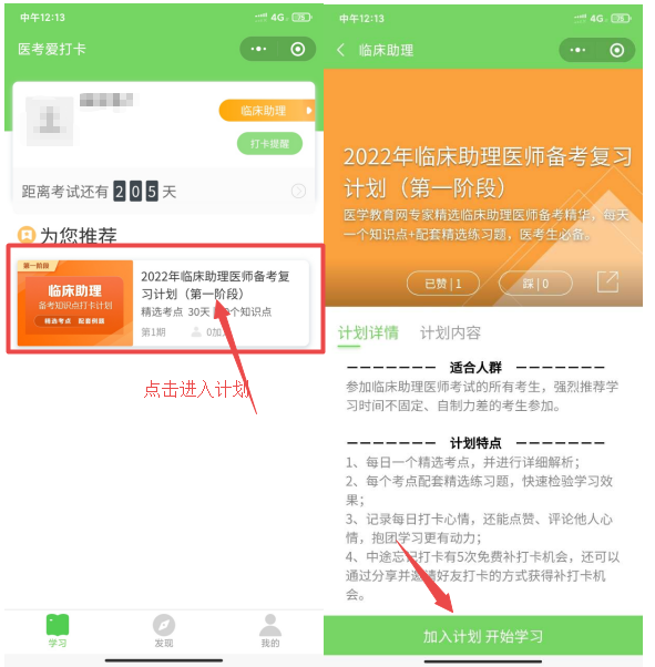 第三步:選擇備考科目后即進(jìn)入學(xué)習(xí)計(jì)劃選擇的頁面,請選擇“您的備考計(jì)劃”,如臨床助理醫(yī)師備考復(fù)習(xí)計(jì)劃(第一階段),然后點(diǎn)擊下方“加入計(jì)劃 開始學(xué)習(xí)”按鈕,開始正式進(jìn)入打卡學(xué)習(xí)。
