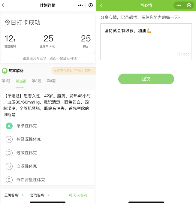 (3)查看測試結(jié)果+答案解析+分享今日打卡心情,提交完成打卡