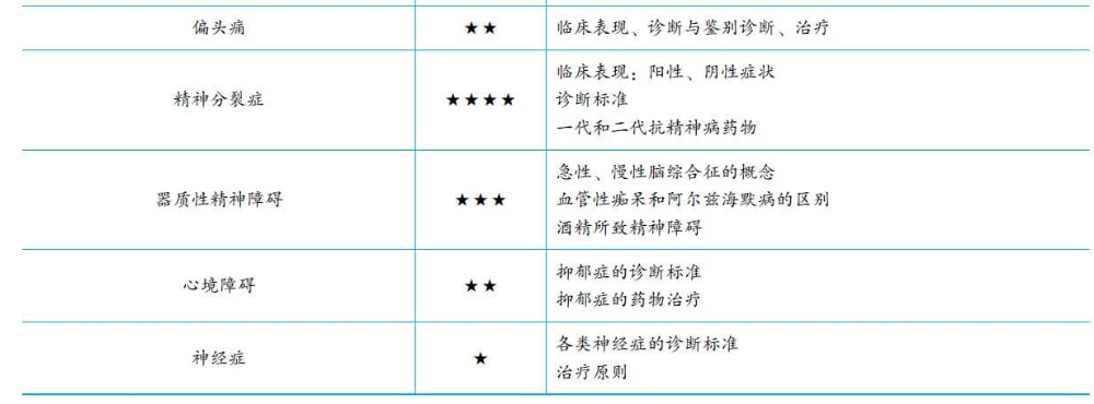 精神系統的題目較好掌握,容易理解,重點是掌握各種精神類疾病的臨床表現,如抑郁癥的診斷標準,精神分裂癥的診斷標準以及治療措施。這2個病已經是每年必考。