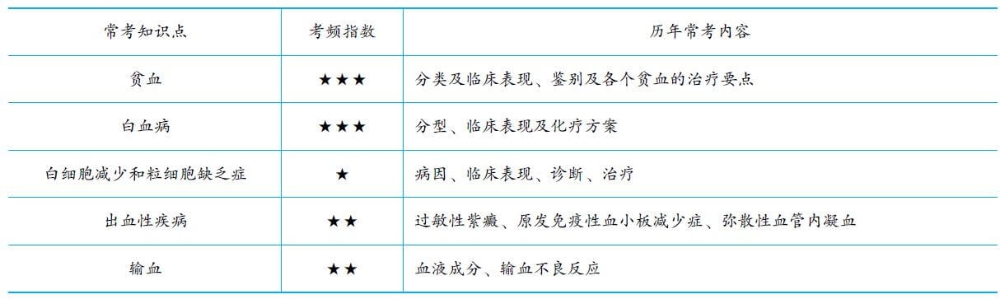 2.考試的重點(diǎn)集中在缺鐵性貧血、再生障礙性貧血、白血病的診斷和治療。對(duì)血液病的診斷標(biāo)準(zhǔn)要嚴(yán)格掌握,例如貧血、白血病的診斷標(biāo)準(zhǔn)。