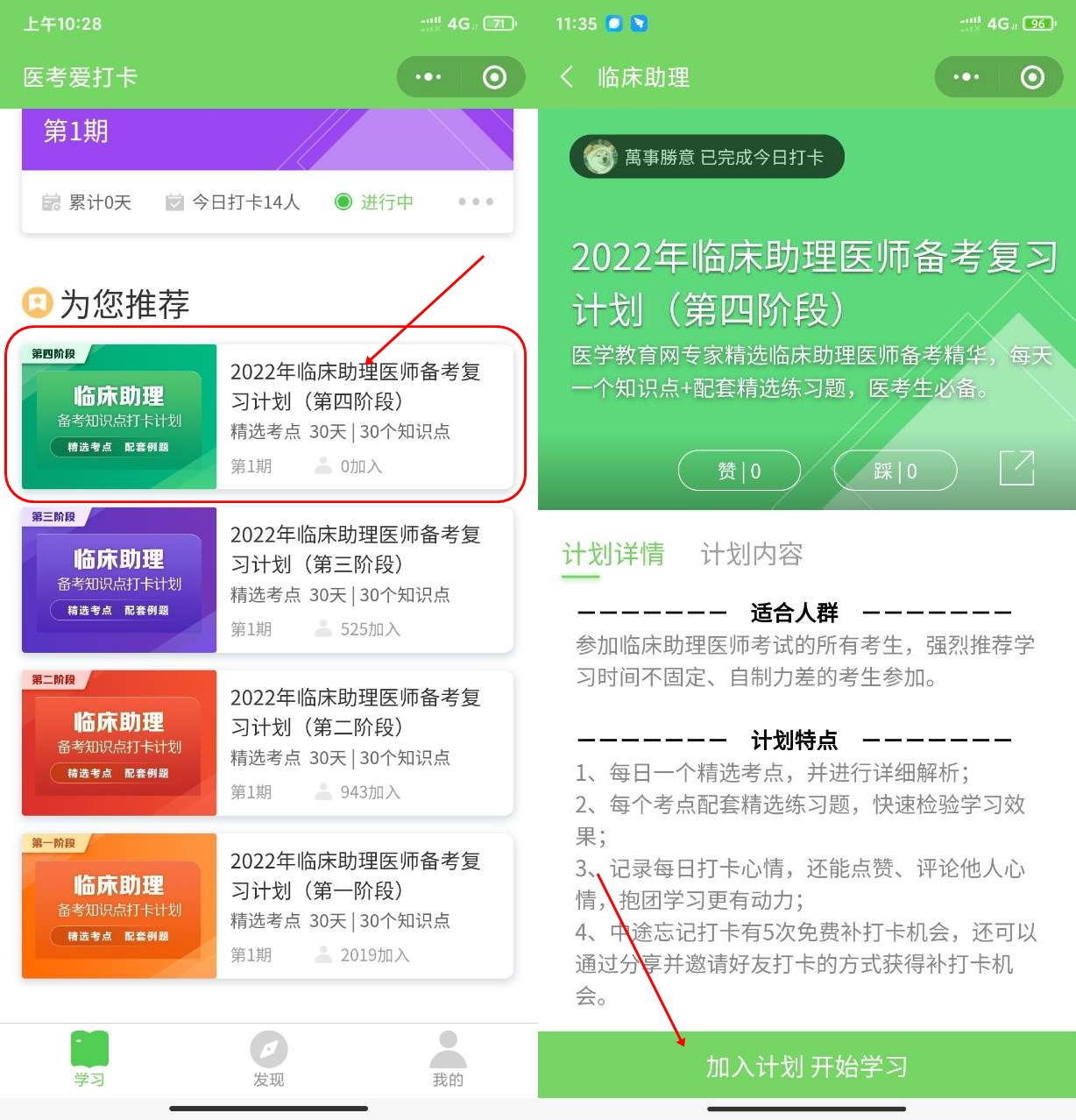 如臨床助理醫(yī)師備考復習計劃(第四階段),然后點擊下方“加入計劃 開始學習”按鈕,開始正式進入打卡學習。