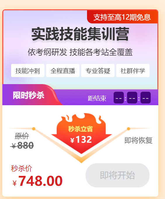 技能沖刺!2022臨床助理技能集訓(xùn)營!冰點秒殺立省132元!30h直播課專業(yè)講師帶你吃透臨床技能重要考點!有關(guān)信息如下(活動時間以活動頁為準(zhǔn)):