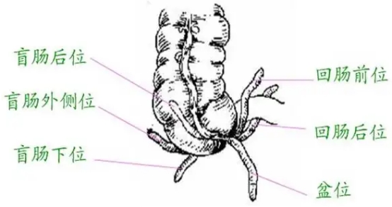 闌尾的解剖位置以其根部為中心,可以如時(shí)針樣出現(xiàn)在360°范圍內(nèi)的任何位置。尋找闌尾的位置不僅利于手術(shù)的開展,還決定了病人臨床癥狀及壓痛部位的不同。