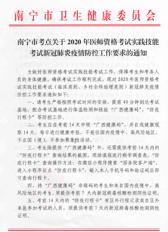 2020年臨床助理醫(yī)師技能考試南寧考點考試期間疫情防控通知