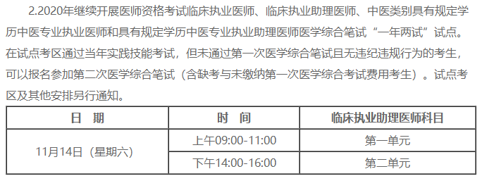 2020國家臨床執(zhí)業(yè)助理醫(yī)師資格考試一年二試考試時間安排
