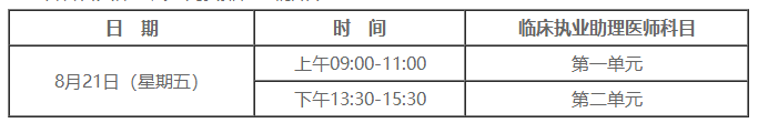 2021年醫(yī)師考試時間暫未公布,可參考2020年考試安排:2020年臨床執(zhí)業(yè)助理醫(yī)師醫(yī)學(xué)綜合筆試一試全國統(tǒng)一考試時間為8月21日: