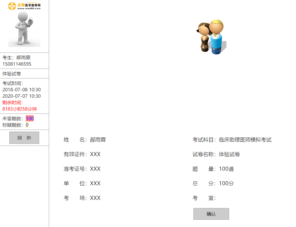 考生成功登錄考試系統(tǒng)后,右側(cè)主頁面顯示考生的基本信息,左側(cè)主要顯示考生信息、試卷名稱、考試時(shí)間、考試時(shí)間倒計(jì)時(shí)提醒、考生未答題和標(biāo)疑題數(shù)量提醒??忌紫韧ㄟ^右側(cè)考生信息區(qū)域核對信息,核對完成后,點(diǎn)擊“確認(rèn)”按鈕進(jìn)入下一頁面。