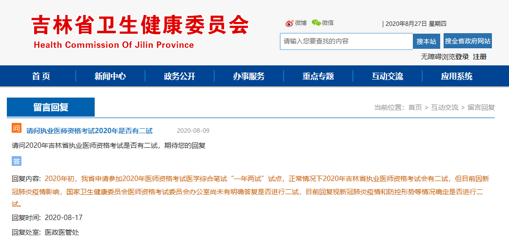 吉林省醫(yī)政醫(yī)管處回復(fù)如下:2020年初,我省申請(qǐng)參加2020年醫(yī)師資格考試醫(yī)學(xué)綜合筆試“一年兩試”試點(diǎn),正常情況下2020年吉林省執(zhí)業(yè)醫(yī)師資格考試會(huì)有二試,但目前因新冠肺炎疫情影響,國(guó)家衛(wèi)生健康委員會(huì)醫(yī)師資格考試委員會(huì)辦公室尚未有明確答復(fù)是否進(jìn)行二試,目前回復(fù)視新冠肺炎疫情和防控形勢(shì)等情況確定是否進(jìn)行二試。