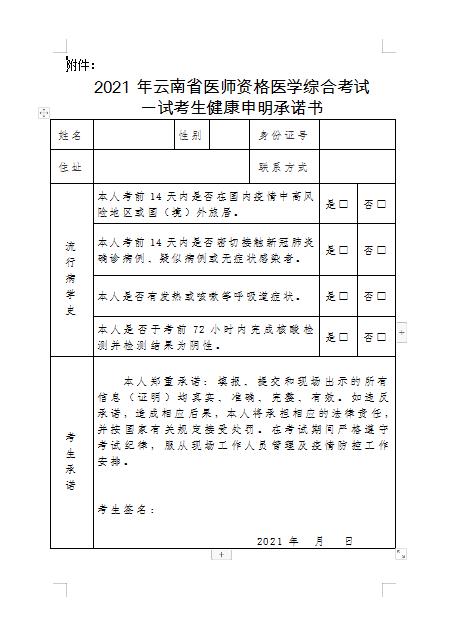 ?云南考區(qū)2021年醫(yī)師資格考試考生健康申明承諾書(下載)